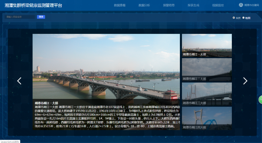 集群橋梁健康監(jiān)測管理平臺可實現(xiàn)24小時實時在線采集數(shù)據(jù)功能,并且引入GIS、BIM、物聯(lián)網(wǎng)、大數(shù)據(jù)等前沿技術(shù),通過數(shù)據(jù)查看、數(shù)據(jù)分析、預警信息、報表生成、視頻監(jiān)控等功能,對橋梁運行狀況作出科學合理的分析研判,同時,系統(tǒng)涵蓋了橋梁全生命周期信息的集成與融合,包括對結(jié)構(gòu)損傷機理的宏觀分析、結(jié)構(gòu)變形及破壞趨勢研究、歸納演繹等,為橋梁養(yǎng)護提供了數(shù)據(jù)支撐。